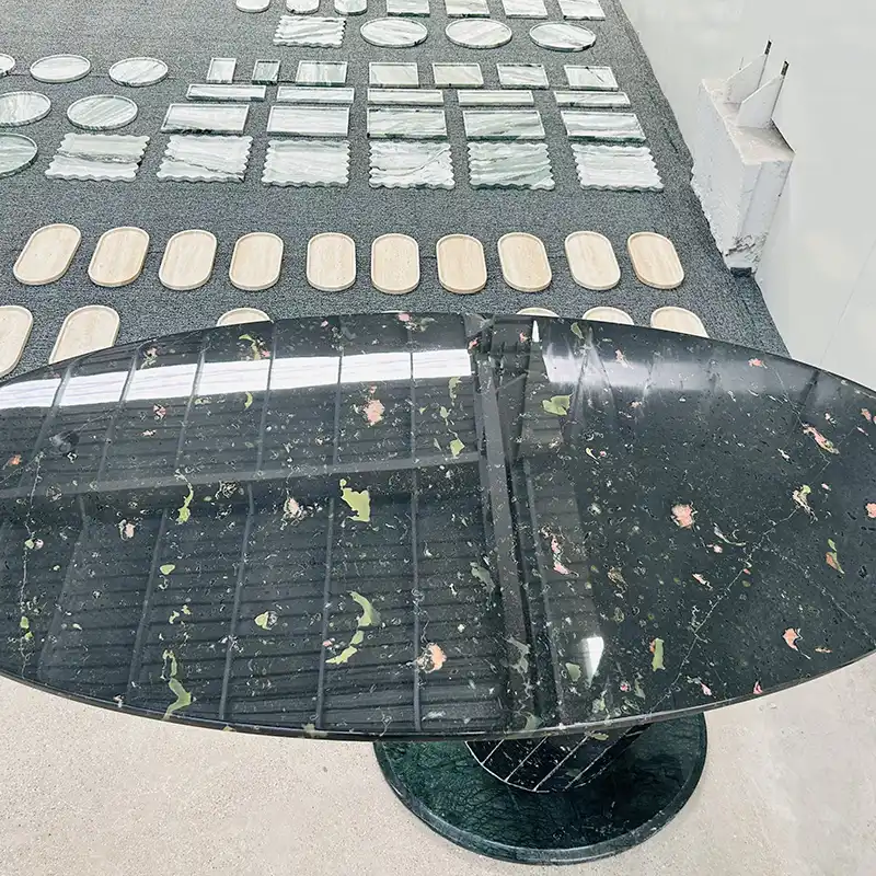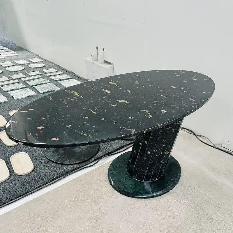 Nejnovější trendy jsou zelené mramorové jídelní stoly v oválných, kulatých jídelních stolech, obdélníkových jídelních stolech a geometrických tvarech. Tento zelený mramorový jídelní stůl je ovál velmi žádán díky svému stylu i funkčnosti.