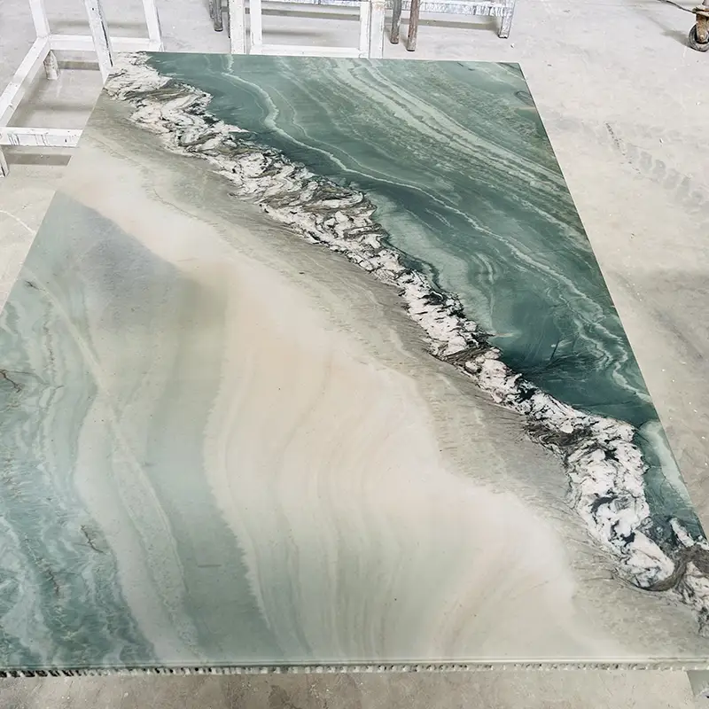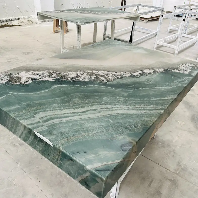 Lehké mudrce až hluboko lesní zeleně mají desky často poutavé žilku bílé, hnědé a zlaté. Každá zelená křemenná deska je přirozeným uměleckým dílem, protože každá z nich je jiná a nabízí vlastní vzhled.
