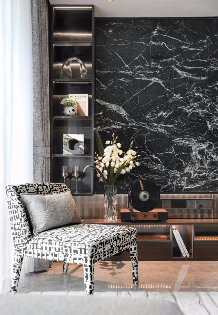 Pokoj je okamžitě vytvořen dramatičtějším a elegantnějším použitím černého mramoru. Vypadá skvěle na podlahách, rámech dveří nebo přízvukové kousky s tmavým pozadím a poutavými žilami. Stačí to používat střídmě, protože příliš mnoho černé může občas dát místnosti chladný nebo těžký pocit.