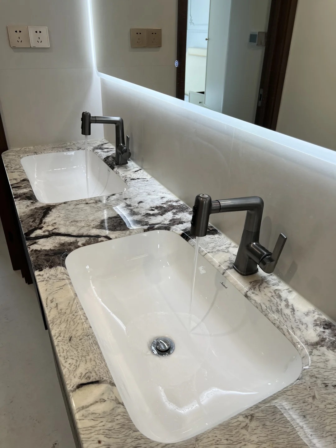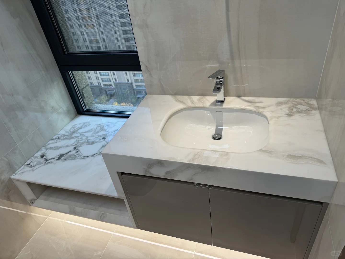 Krásný design dřevěná skříňka se krásně páruje s bílou mramorovou deskou s ohromujícím žilkem.Calacatta zlatý mramordoplňuje ozdobené lišty a křišťálové akcenty, což dává místnosti nadčasový pocit.
