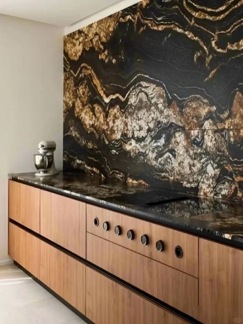 Asijské špičkové domy také mají magma zlatý žulu jako preferovanou ložnicovou zeď nebo dokonce na celovečerní luxusní kamenné ostrov v kuchyních. Jakýkoli luxusní kamenný interiér získává bohatství z dramatických třpytů kovových žil.