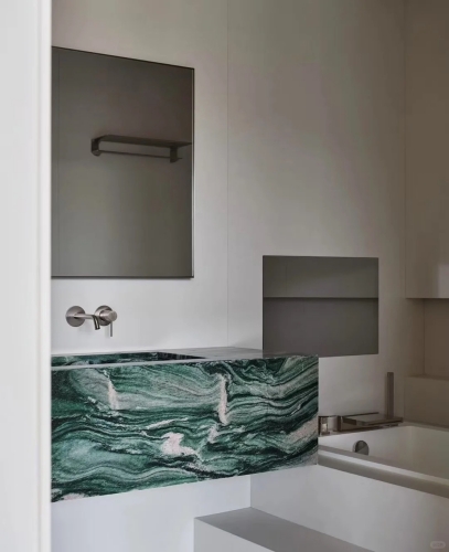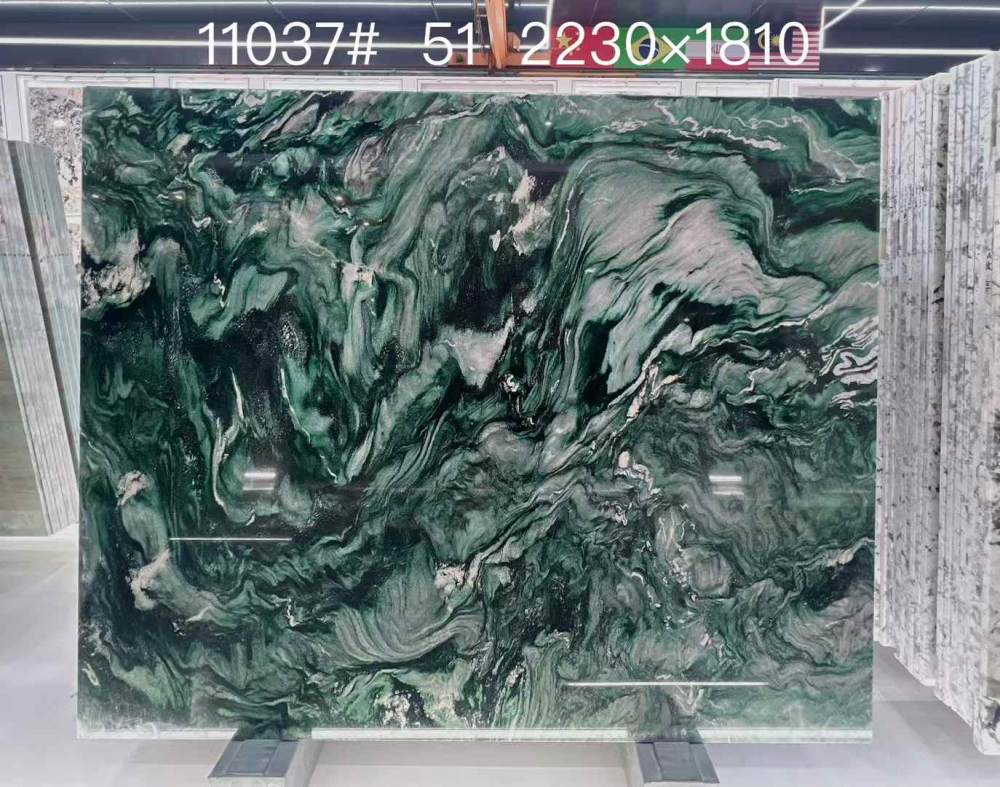 Green Laponia QuartziteJe zejména patrné v kuchyních a koupelnách moderních luxusních domů. Chcete -li zdůraznit jeho brilantní postavu, zkuste to s matnými bílými dřezy nebo kartáčovanými zlatými kohoutky. V odvážném brazilském křemenném stole nebo krbu křemene ho použijte jako ohnisko.