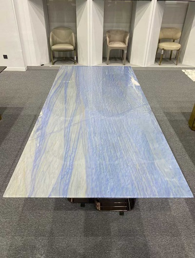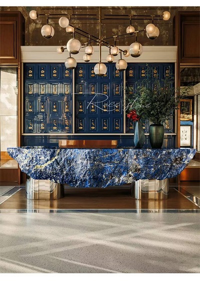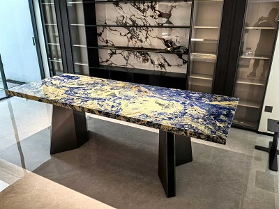 Modré kameny již nejsou jen pro desky; Mohou být také použity na nábytek. Azul Macaubas Quartzitové desky, které jsou jen 2 cm tlusté, vytvářejí krásné plovoucí panely postele s podsvícení, které vypadají jako zářící oblak. Můžete tvarovat modrý sodalite do nohou stolu nebo podporovat sloupy pro kávovarné stoly a poté je zakryjí skleněnými vrcholy, aby se vytvořily „sloupy hluboké moře“.