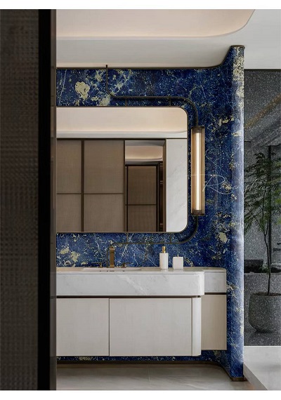 Blue Sodalite vyrábí skvělé přízvukové kousky, jako jsou okraje na kuchyňských ostrovech nebo tenké proužky na modrých mramorových jídelních stolech. Lesk drahokamu jde dobře s matnými černými skříněmi a přidává třídu, aniž by byl příliš mnoho. Když jsou spárovány s matným sklem, Sodalite Royal Blue Dlaždice nebo desky vytvářejí klidný, ale luxusní sprchový prostor v modrých mramorových koupelnách.
