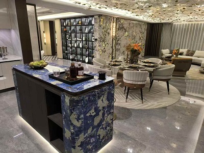 Kontrast a bohaté materiály jsou velmi důležité při lehkém luxusním designu. Velké desky modrého sodalitu používané jako kuchyňské ostrovy nebo jídelní stolní vrcholy předvádějí v celé své slávě oceánské modré žíly. Přidání mosazných nebo zlatých kovových nohou a křišťálových lustrů způsobuje, že věci vypadají ještě elegantnější. Leštěné o 45 stupňových zkosených okrajů na modrých mramorových deskách způsobí, že se světlo odrazí z nich více a dává celé věci dražší vzhled.