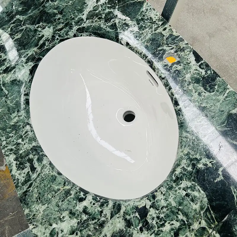 Verde Rameggiato Marble Vanity Top je více než deska; Dováží krásu, mír a sofistikovanost, které nikdy nevyjdou stylově do vaší každodenní rutiny. Tento produkt představuje pro každou místnost něco zvláštního, ať už stavíte klidné útočiště ve vašem domě nebo přestavíte luxusní hotelovou koupelnu.
